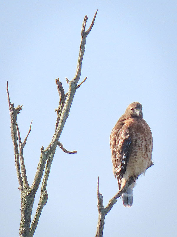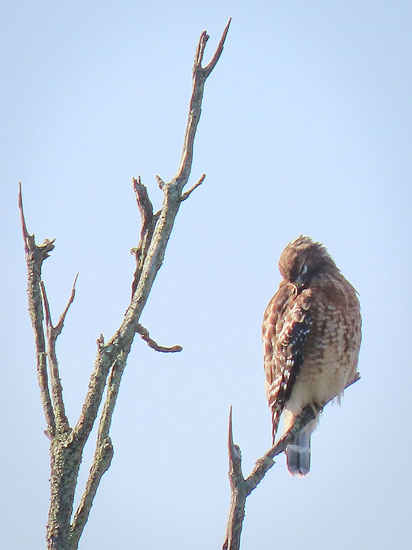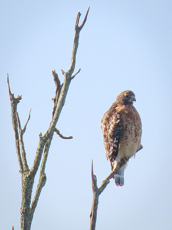 The Red-shouldered Hawk (Buteo lineatus) in its usual spot far across the marsh.