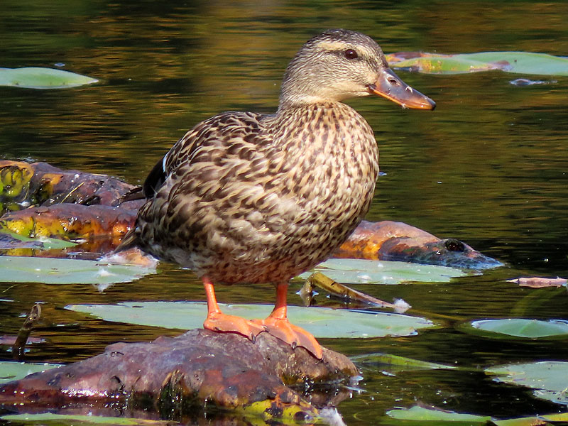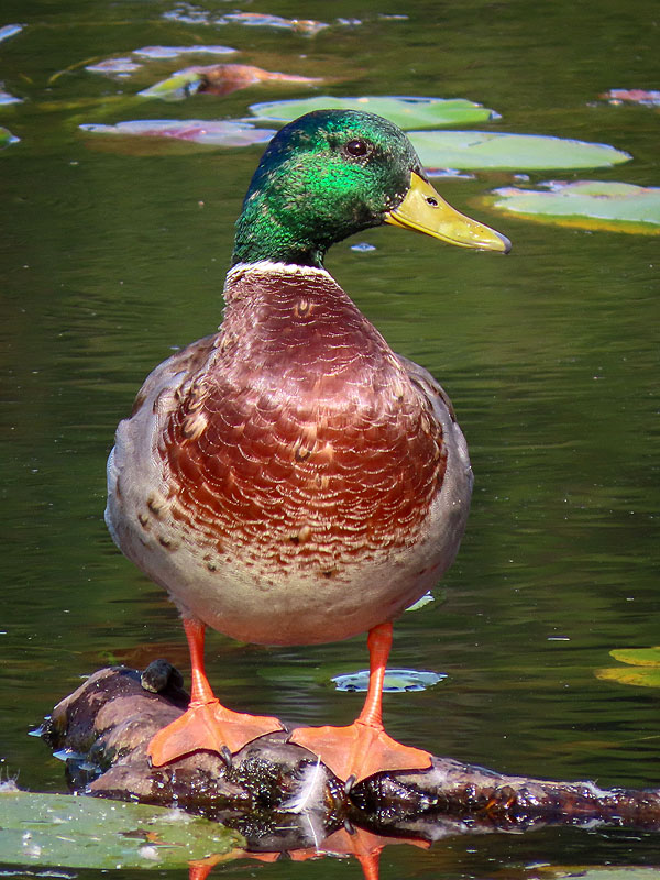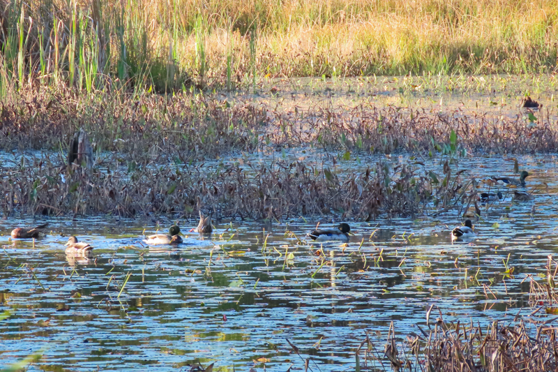 Eight or nine of roughly 15 Mallards (Anas platyrhynchos).