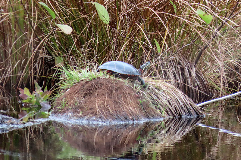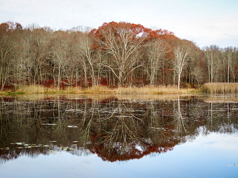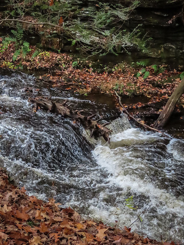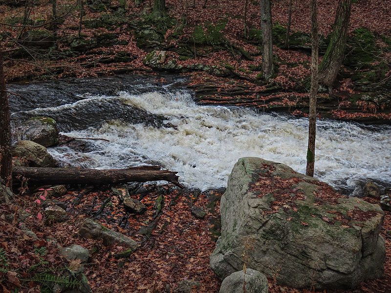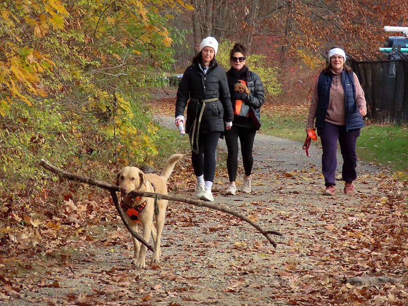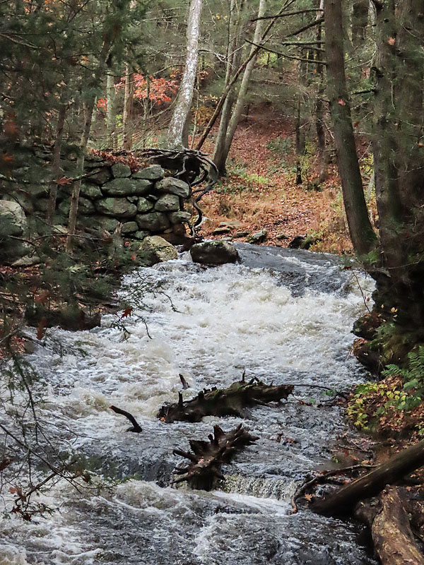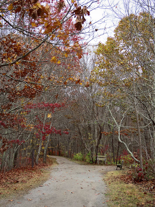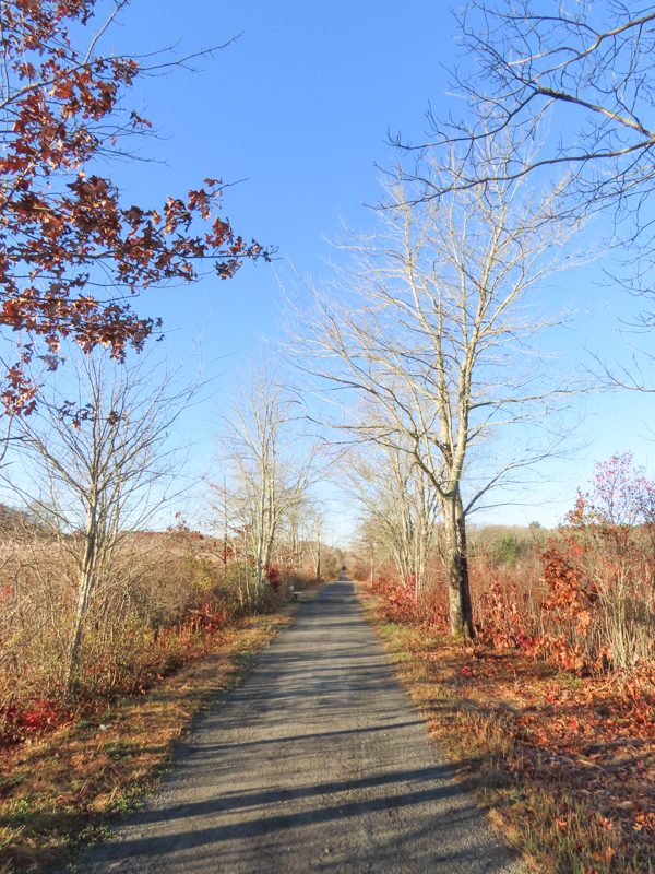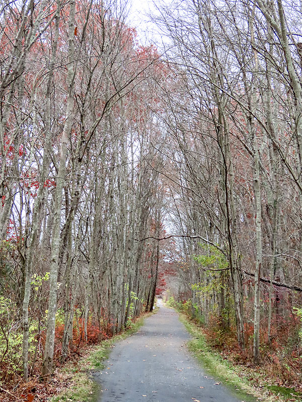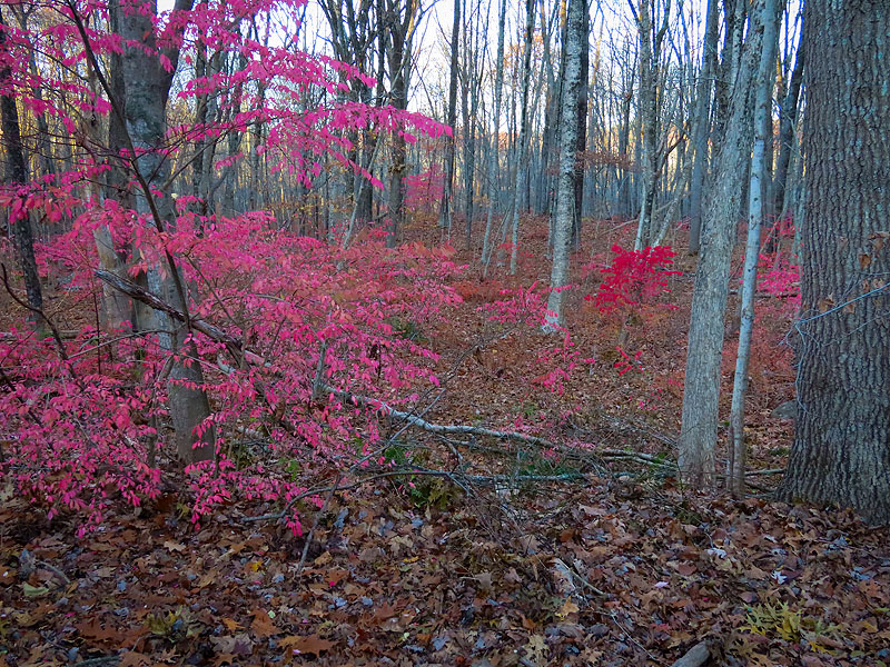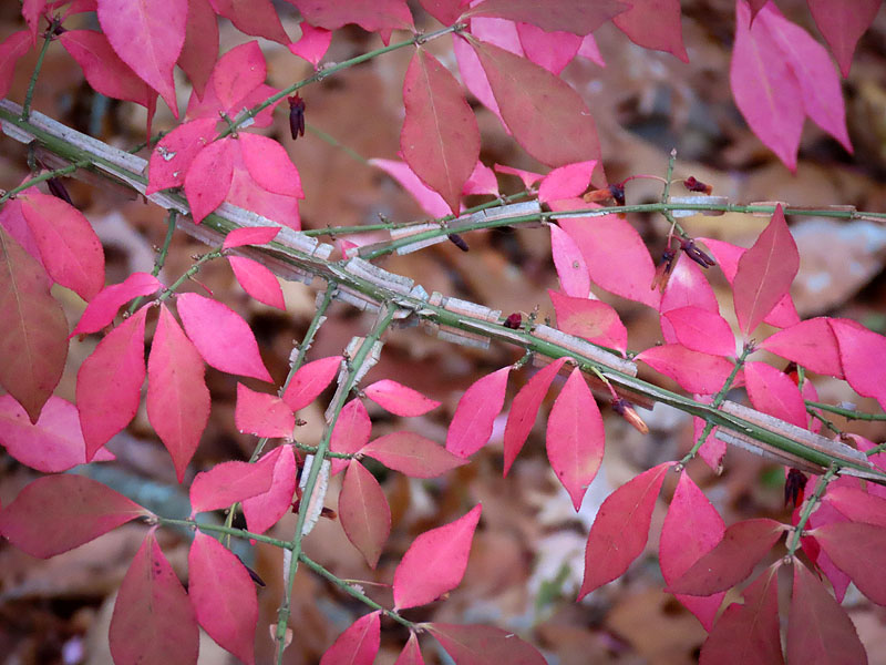 Winged Euonymus or Burning Bush (Euonymus alatus) is a HIGHLY INVASIVE shrub found in wooded areas all along the trail. Seeds are spread in bird droppings. Note the flat corky extensions along the stems - they're definitive, even when leaves are not in the dramatic Fall pink.