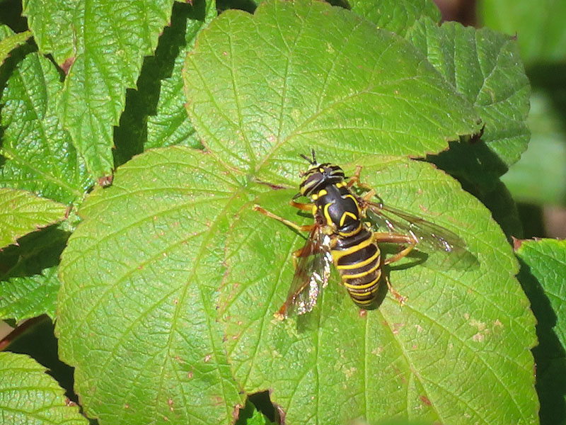 A superb wasp mimetic Syrphid Fly (Spilomyia longicornis).