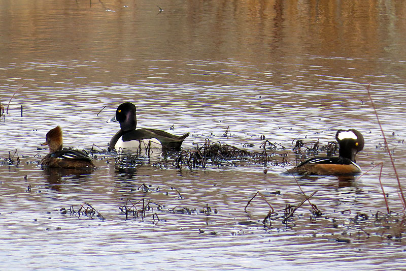 A pair of Hooded Mergansers (Lophodytes cucullatus) and a male Ring-necked Duck (Aythya collaris).
