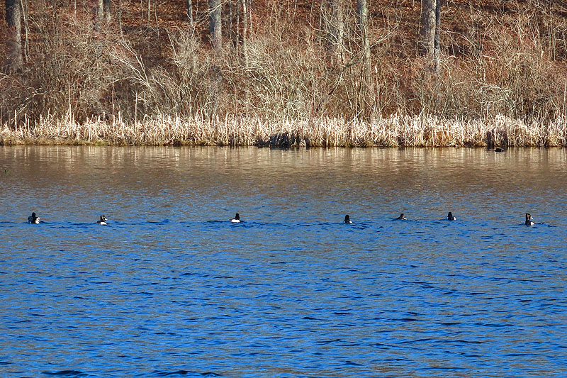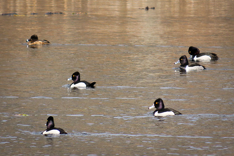 Six Ring-necked Ducks; female upper left.