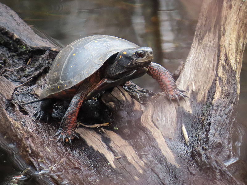 One of two Spotted Turtles (Clemmys guttata) in the drainage channel across the trail from the pond. Much less commonly seen than Painted Turtles.
