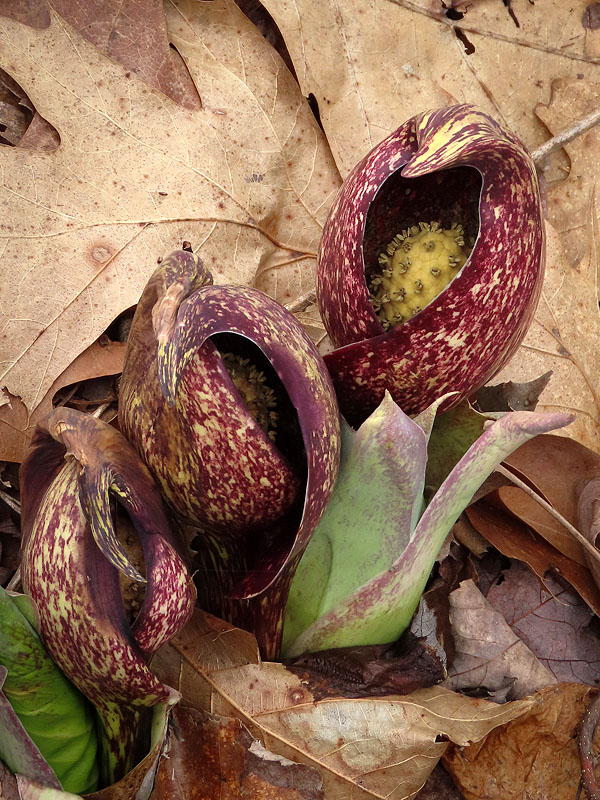 Skunk Cabbage (Symplocarpus foetidus). At the upper right, note the rounded yellow spadix with it's array of tiny flowers nestled inside the speckled maroon spathe.