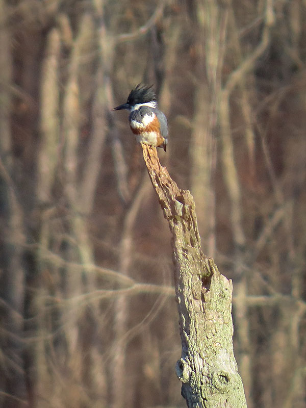 A female Belted Kingfisher (Ceryle alcyon). First time I've caught it perched. For a week or more I've heard it and seen it flying far across the marsh.