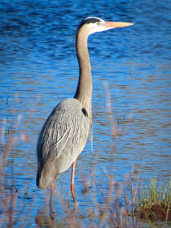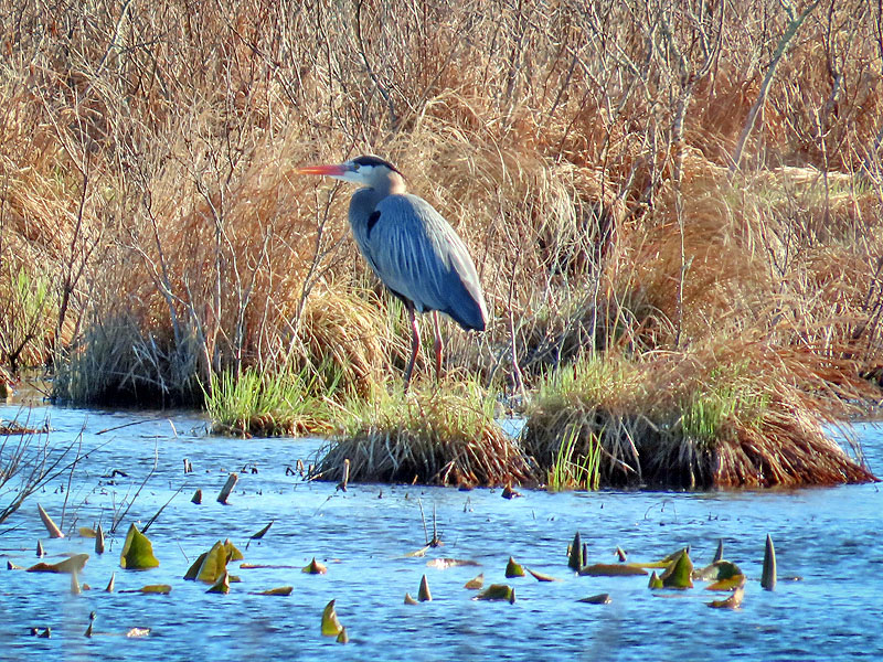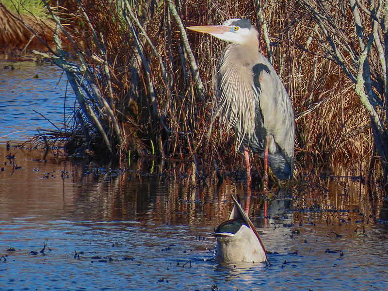 Great Blue Heron (Ardea herodius) and male Mallard (Anas platyrhynchos).