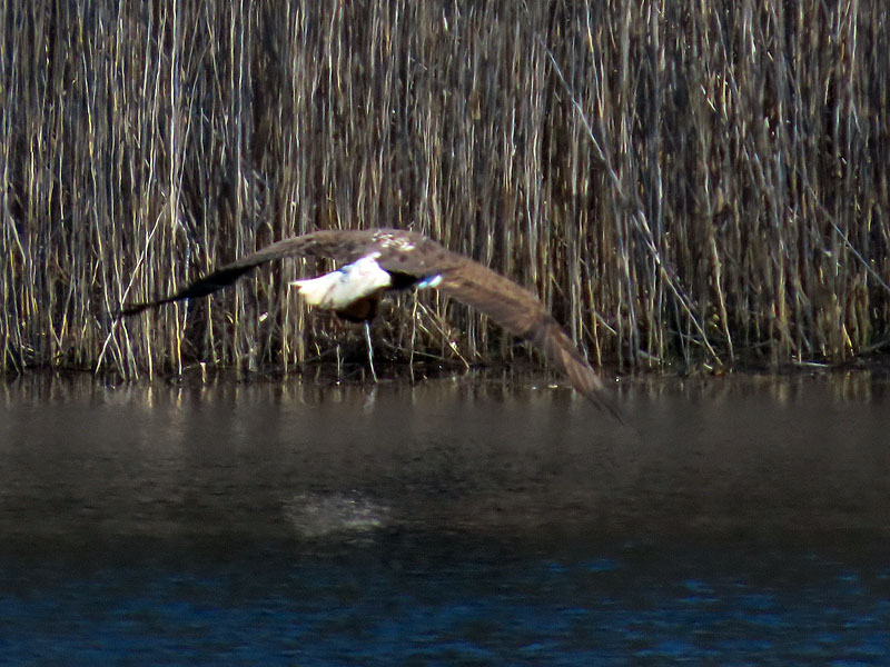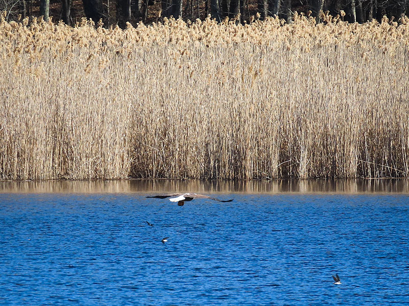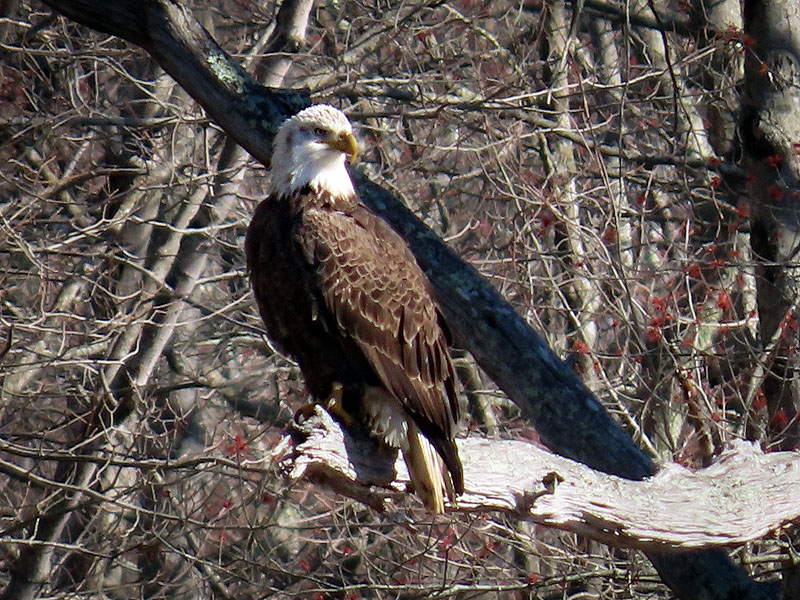 I stopped by Norton's Pond off River Road for a quick look. Nothing happening so I got back into my truck... and saw this adult Bald Eagle (Haliaeetus leucocephalus) circle low. Got out and was able to spot it perched far across the pond.