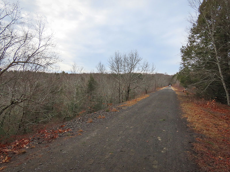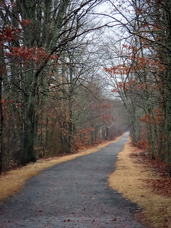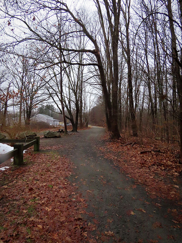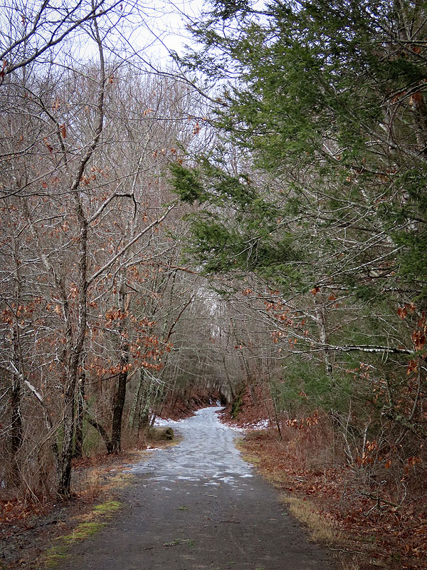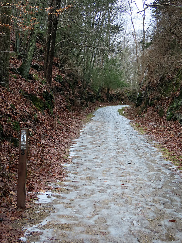 Nearing the rock cut by Bull Hill Road, there was quite a bit of ice. Although I was wearing cleats, I stayed at the edges where most of the ice was gone.