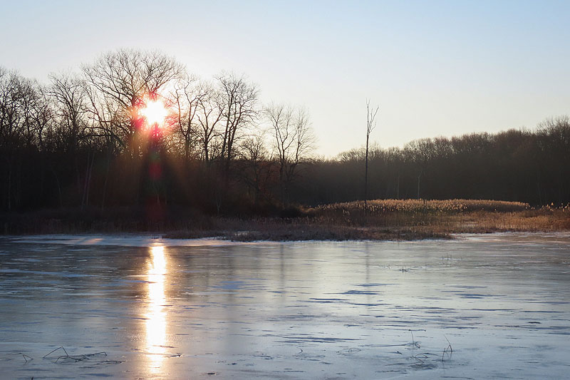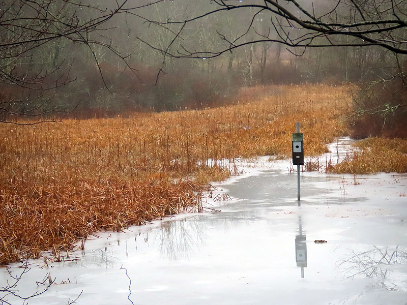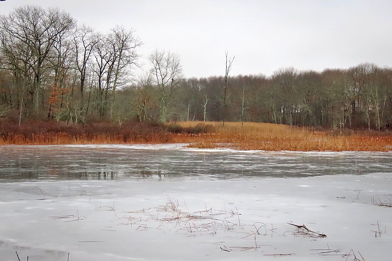 A brief stop at Norton's pond. The orange sand/clay surface of the trail was a thawed mess.