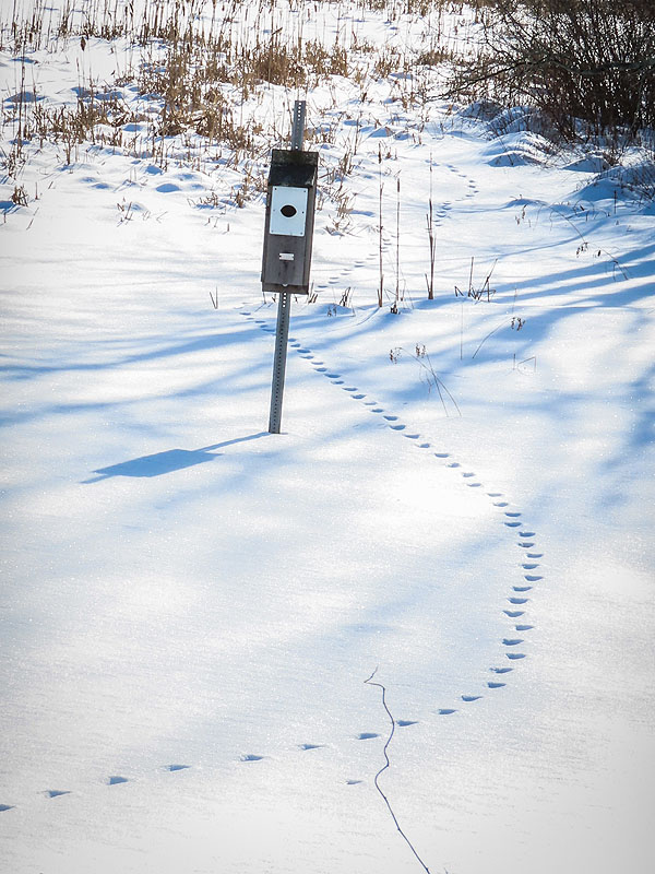 February 4th. The snowmobile had been out again and further compacted the snow - tamping down the footprints that had made walking more dificult. Mine were today's first footprints - and not deep at all.