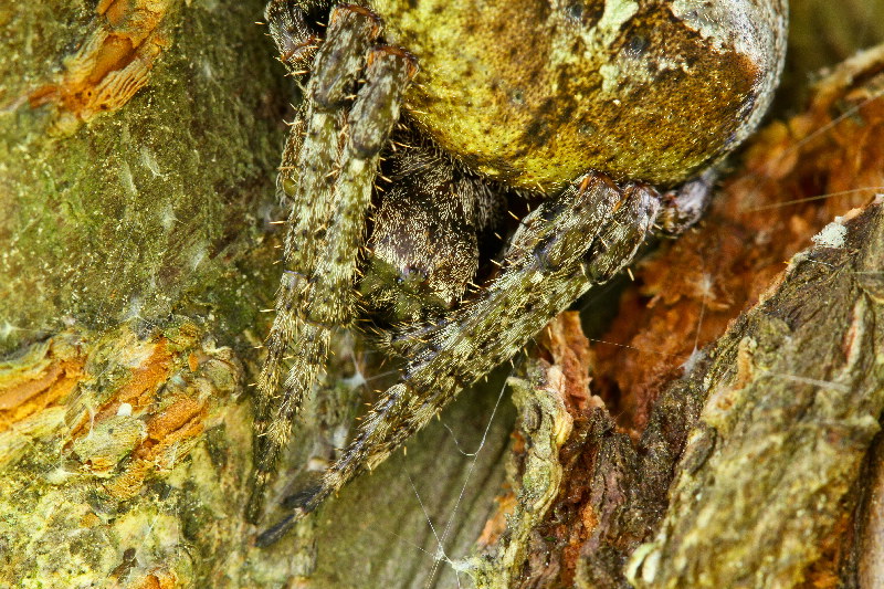 August 14th. I lifted her leaf "umbrella" in order to get a better view of the zig-zag pattern on her abdomen. With thanks to Juan Sanchez, I can confirm that this is the Giant Lichen Orbweaver (Araneus bicentenarius).