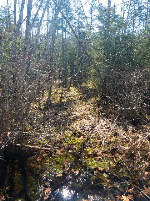 Seventyseven degrees today, yet note the ice remaining in the shade of the cedars.