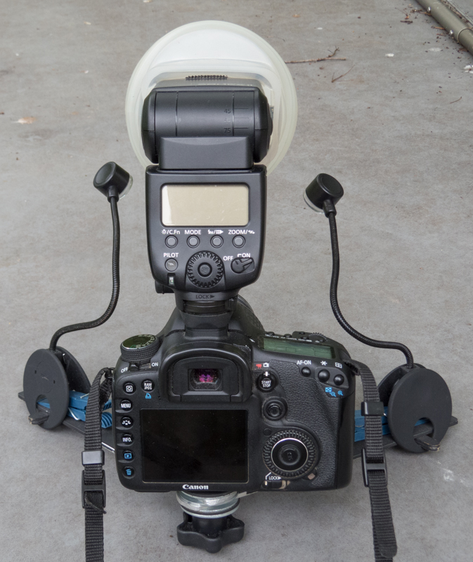 Note that for daylight flash-supported macro photography, I use several alternative variants on this rig, some using the camera's pop-up flash and foil covered panels left and right to provide indirect, diffuse light on the subject. The inspiration for these designs is the superb macro photography and clever macro flash rigs of Art Vaughan. Art is very gracious about sharing designs, part lists, and troubleshooting tips. (Thanks Art!)