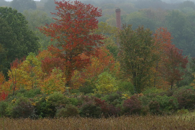 Winterberry (Ilex verticillata) berries are now bright red, offering nice contrast to the green and maroon leaves that will soon fall away.