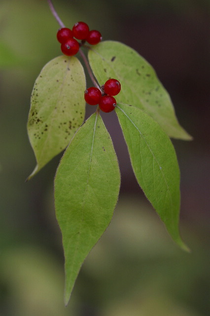 Morrow's Honeysuckle (Lonicera morrowsii) retains its leaves and berries.