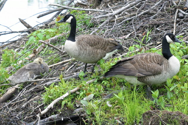 A pair of Canada Geese (Branta canadensis) with a single "teenaged" gosling (resting, at left).