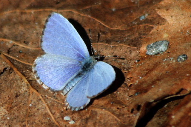 April 1st. Spring Azures (Celastrina ladon) are flying. This is a male, based on the narrow black forewing margins.