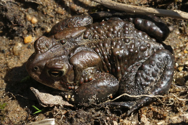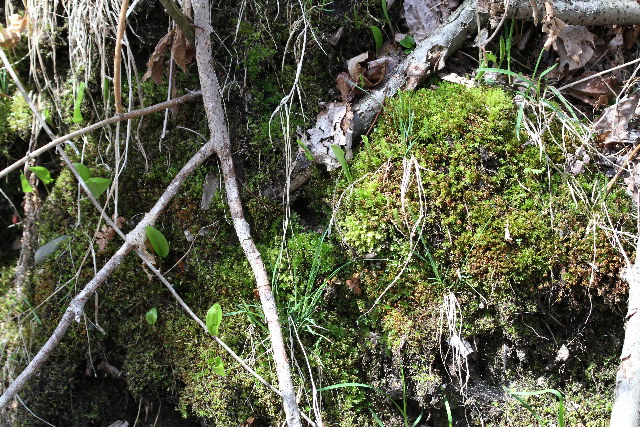 Bumble Bee queens were active in their burrows on a mossy bank amid tree roots just west of Leonard Bridge Road. A burrow entrance is dead center in this photo.