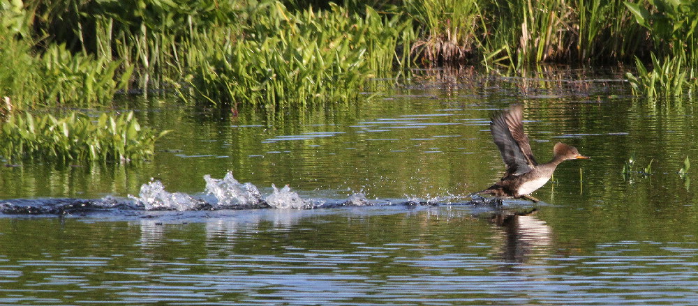 May 16th. A group of young and/or female Hooded Mergansers (Lophodytes cucullatus) could be briefly viewed through trailside shrubs.