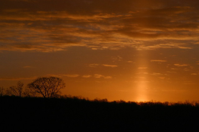 A Sun Pillar! From a NASA web site: "When the air is cold and the Sun is rising or setting, falling ice crystals can reflect sunlight and create an unusual column of light. Ice sometimes forms flat, six-sided crystals as it falls from high-level clouds. Air resistance causes these crystals to lie nearly flat much of the time as they flutter to the ground. Sunlight reflects off crystals that are properly aligned, creating the sun-pillar effect."