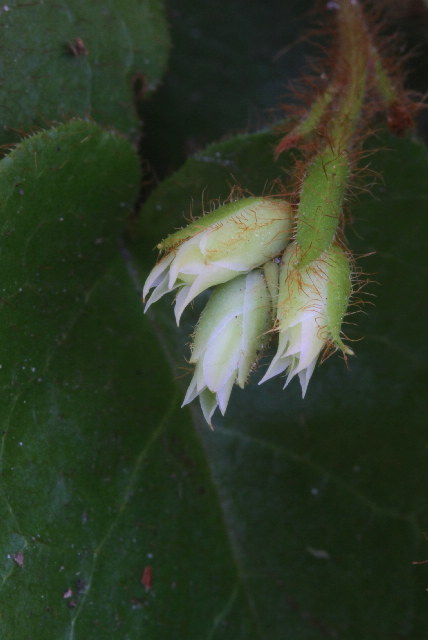 Speckled red Skunk Cabbage (Symplocarpus foetidus) spathes have opended to reveal the yellow flowers (such as they are) on the rounded spadix inside. Beside the spathes are the first tips of what will soon be unfolding green leaves.