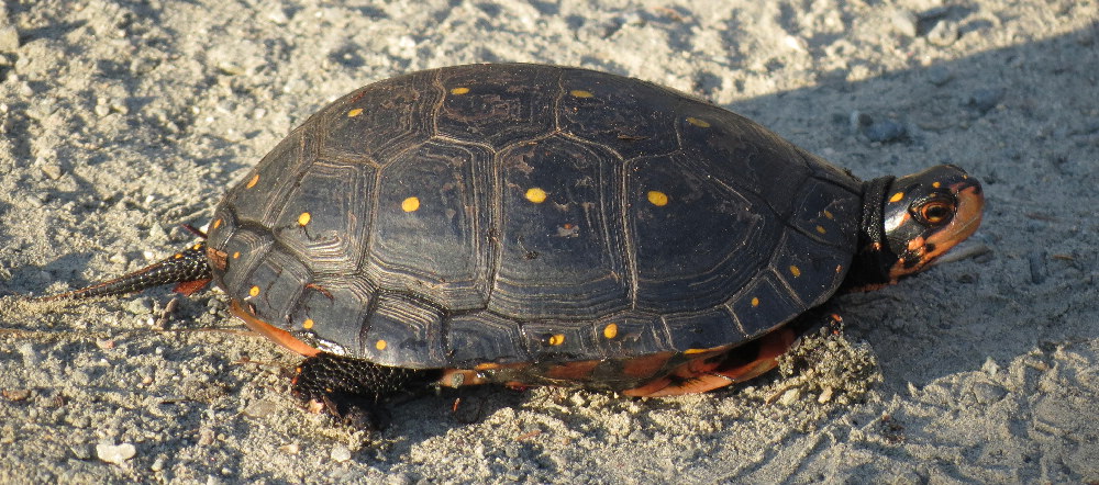 April 17th. A Spotted Turtle (Clemmys guttata)... spotted crossing the trail near the junction of the Colchester Spur.
