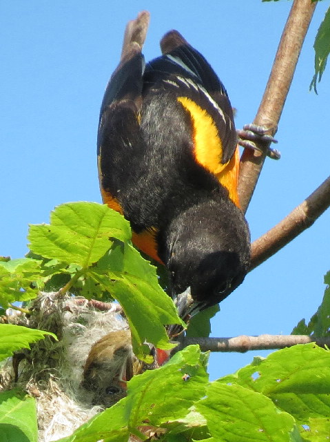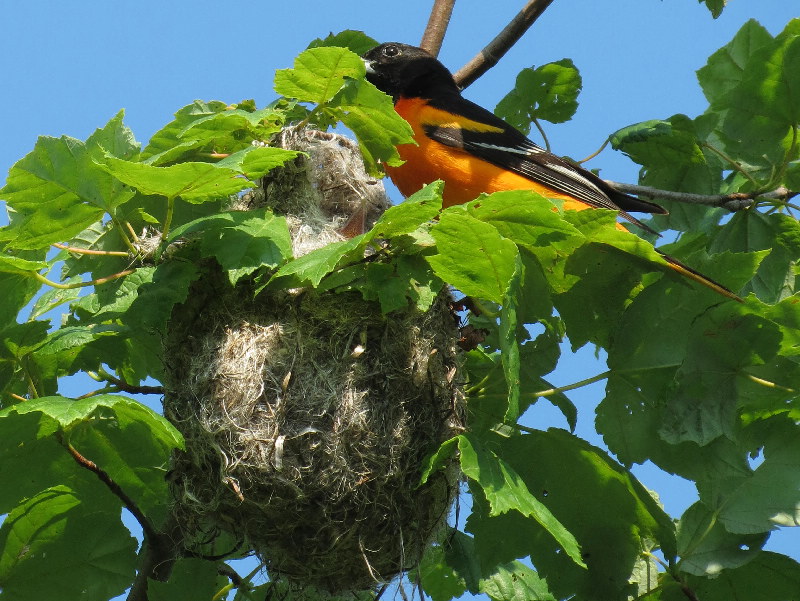 The Baltimore Oriole (Icterus galbula) nest is backlit in the morning; almost impossible to see anything. With some software tweaking of this image, I can make out three or four chicks.