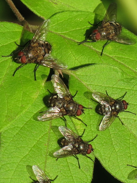 By 8:00 AM, the flies had nearly all dispersed. I've seen similar aggregations at the exact same location in previous years. Over the next several weeks, I saw similar aggregations at this spot on sunny mornings.