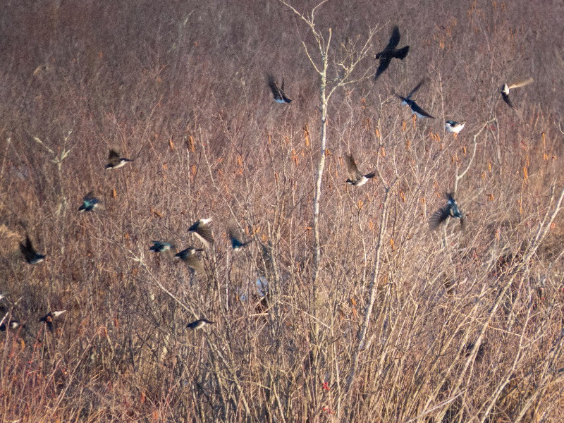 April 3rd. I noticed a flock of Tree Swallows (Tachicineta bicolor) congregated in a bush far across the marsh. Roughly 28 birds in this photo.