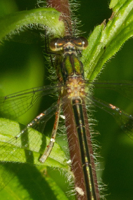 Best guess is a female Emerald Spreadwing damselfly (Lestes dryas), but wait, there's something odd about the photo...