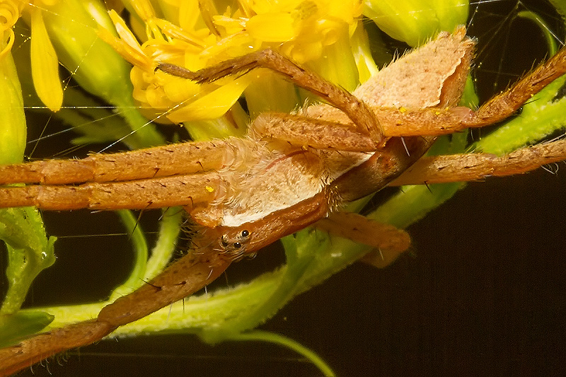 Nursery Web Spider (Pisaurina mira), lurking on Goldenrod.