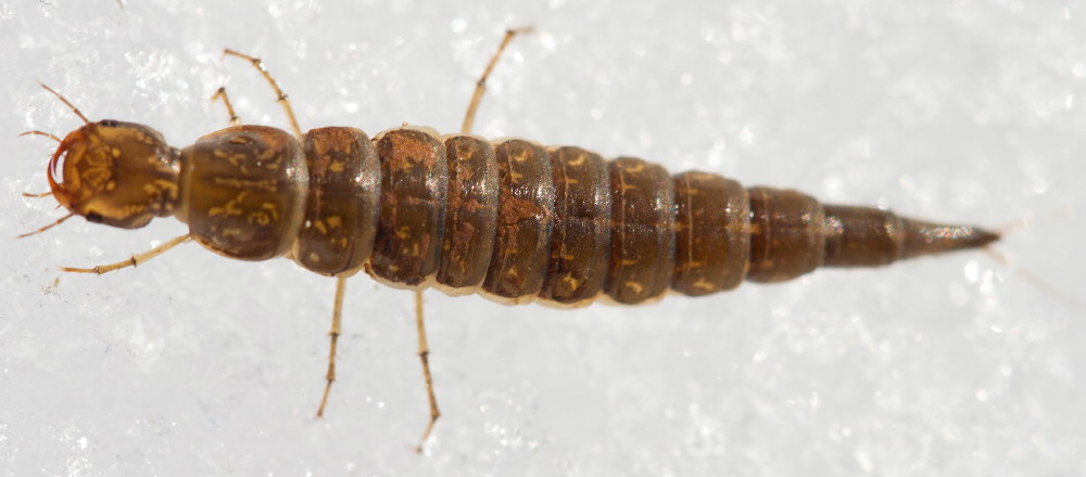 But the real shocker was this beetle larva actively crawling over the snow. I'm trying to get an ID, but for now I'll guess Adephaga: Carabidae or possibly Dytiscidae.