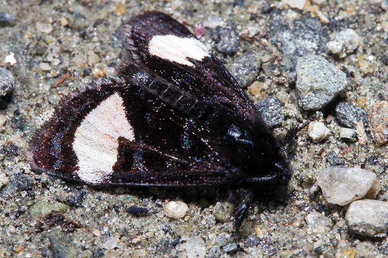 Appearing mostly black above, there is actually a subtle pattern of metallic blue-purple scales on the forewings.
