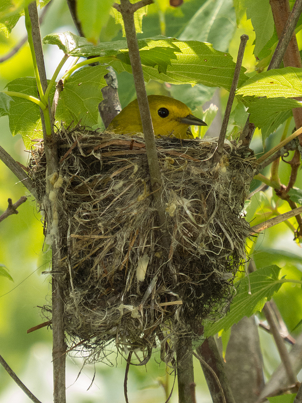 June 11th. A female Yellow Warbler (Dendroica petechia) incubating eggs.)