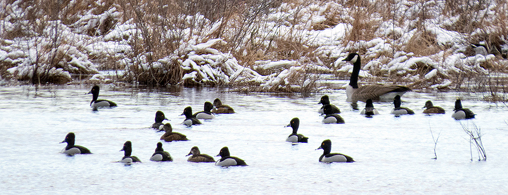 The Ring-necked Ducks (Aythya collaris) were still around, though they will likely move on soon.
