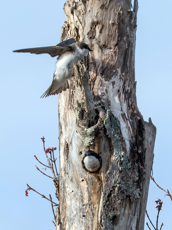 May 2nd. The Tree Swallows (Pachycineta bicolor) have definitely moved in to the old woodpecker hole.