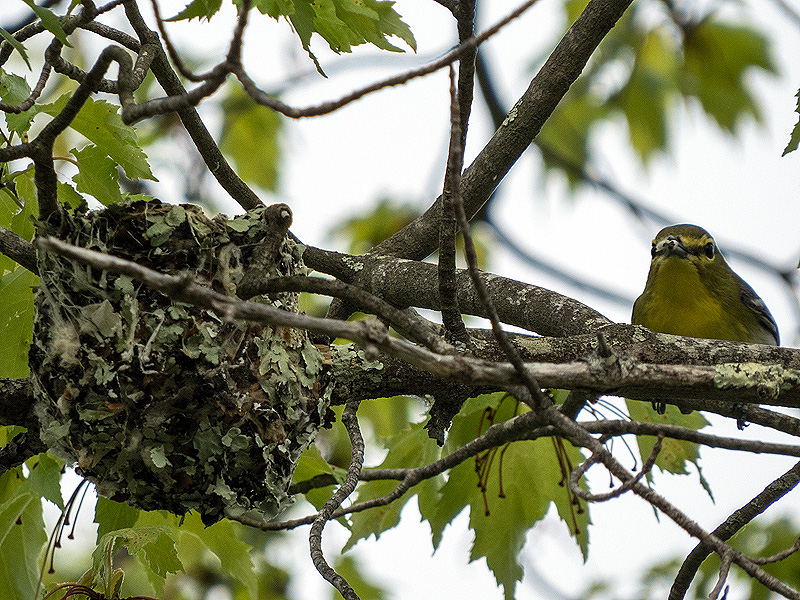 Activity at the Yellow-throated Vireo (Vireo flavifrons) nest. This series taken from 8:11 to 9:12 A.M. Most of that time, one bird or the other was snuggled deep in the nest. Transitions between the pair were very fast. Many of these pictures were taken during brief nest maintenance chores.