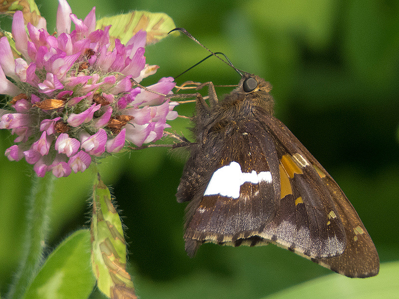 A Silver-spotted Skipper (Epargyreus clarus) nectaring on Red Clover (Trifolium pratense).