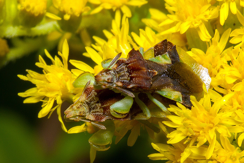 A pair of Ambush Bugs (Phymata sp.). Note the "muscular" looking raptorial front legs.