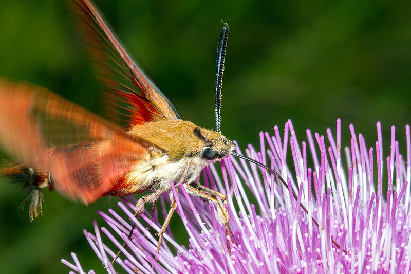 The thistles were being visited by a Hummingbird Clearwing sphinx moth (Hemaris thysbe).