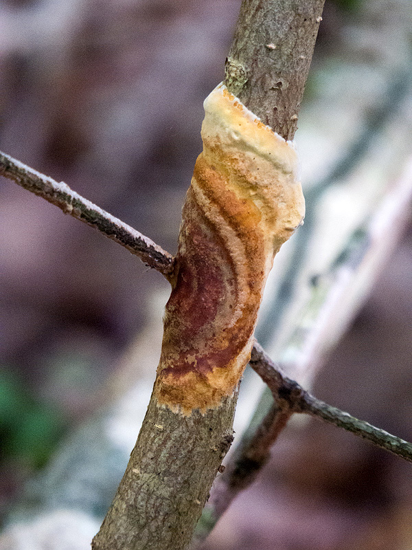 Thanks to Terry Stoleson, I now have an ID for this fungus. It's Hymenochaete agglutinans. Note how it develops where two pieces of dead wood are in contact. (More easily seen in the next two pictures.)