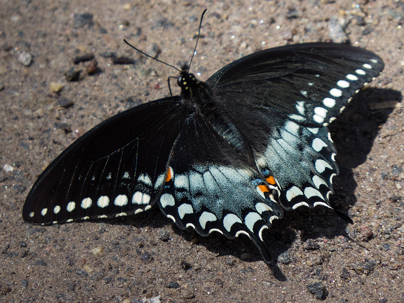 A male Spicebush Swallowtail (Papilio troilus) extracting essential minerals from the trail surface.
