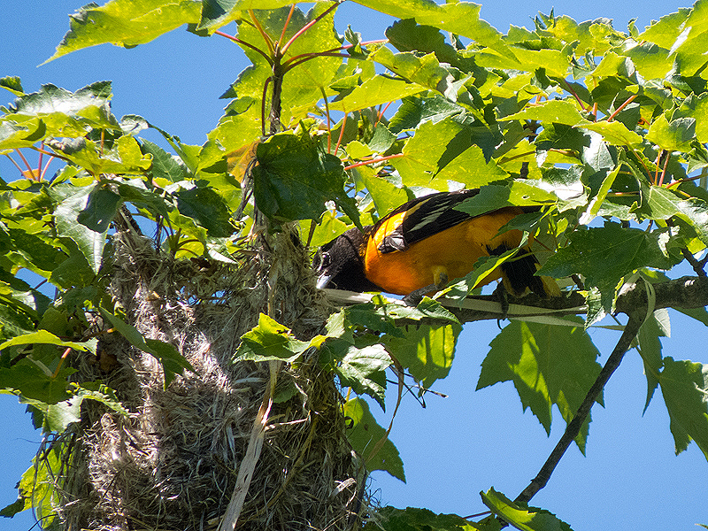 The female Baltamore Oriole (Icterus galbula) at the nest above the trail.