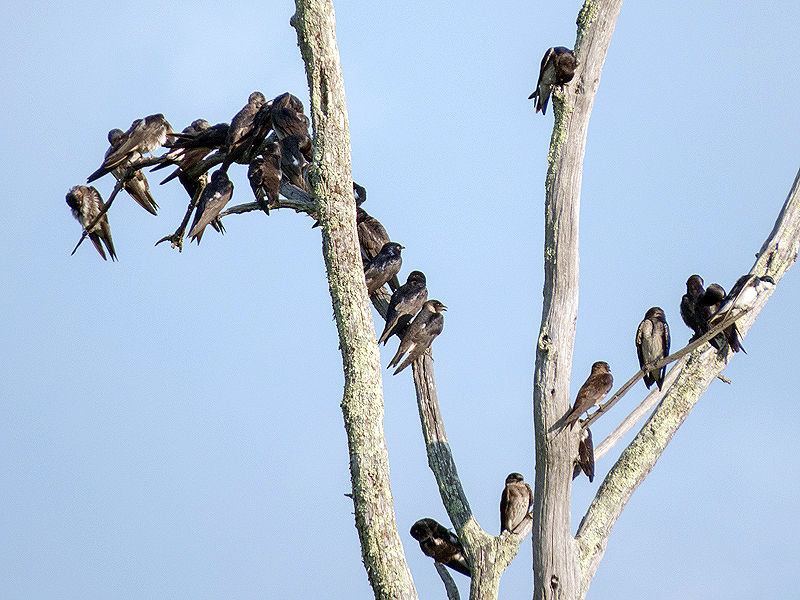 This cluster seems to be all Purple Martins (Progne subis) except for one Tree Swallow at the right.