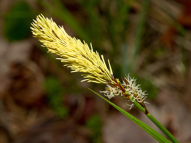 Pennsylvania sedge (Carex pensylvanica). This quote from the New Hampshire Garden Solutions site (https://nhgardensolutions.wordpress.com/category/wildflowers/): "Most people never see the beautiful flowers of Pennsylvania sedge (Carex pensylvanica) that appear on tufts of grassy looking plants in mid-April. Creamy yellow male staminate flowers release their pollen above wispy, feather like, white female pistillate flowers but the female flowers always open first to receive pollen from a different plant. As the plant ages the male flowers will turn light brown and the female flowers, if pollinated by the wind, will bear seed. It’s a beautiful little flower that is well worth a second look. I see them just about everywhere I go."
