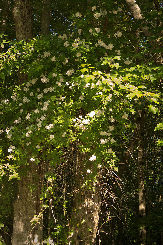 Multiflora Roses (Rosa multiflora) climbing high into a maple at the Route 85 trailhead. The scent is strong.