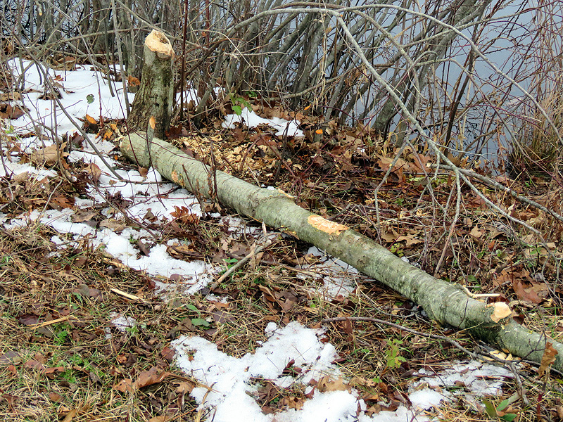 Beavers have taken down several small trees, carting off the branches for building or a submerged food cache.