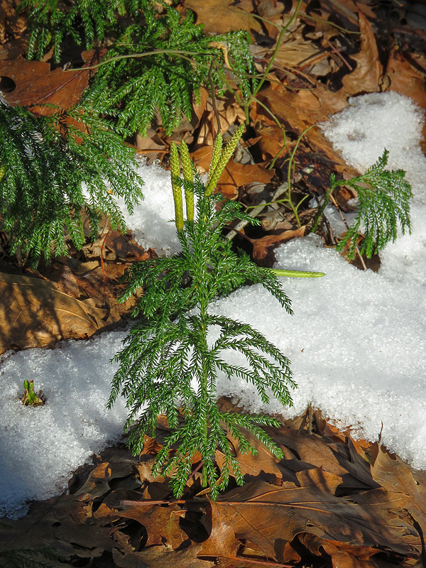 Ground Pine (Lycopodium obscurum). In the early days of photography, Lycopodium spores were collected and used as flash powder: spread out in a shallow tray, ignited to produce a burst of white light.