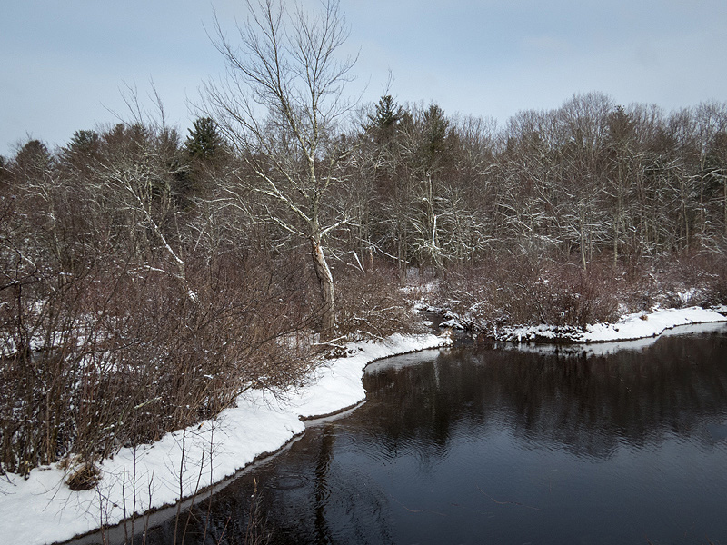 March 28th. Beavers have been working on four large trees near their lodge and dam at the pond east of Route 207. The dam is at the far left; the lodge just right of center.