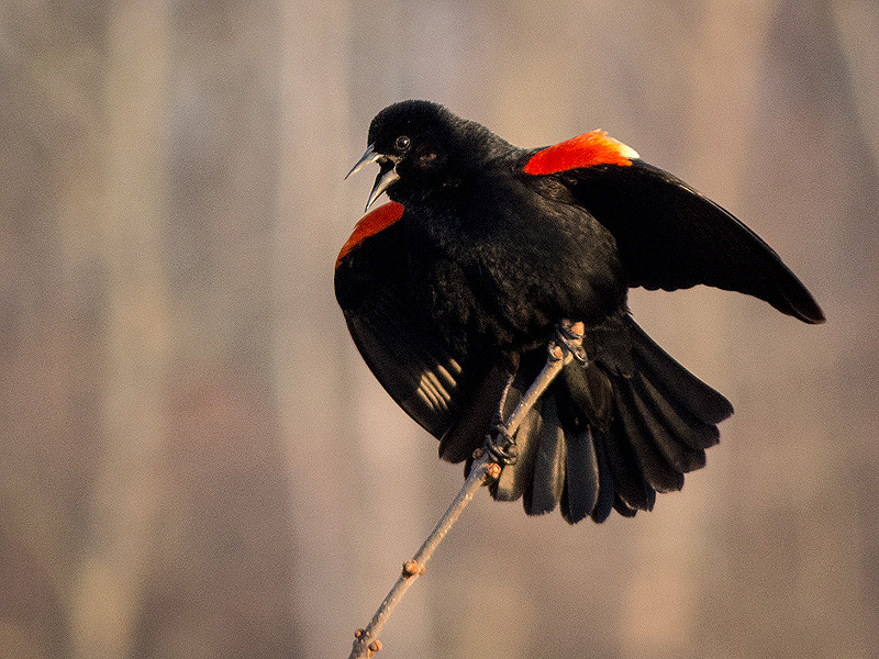 Red-winged Blackbird (Agelaius phoeniceus), and Red Maple (Acer rubrum) starting to bloom.